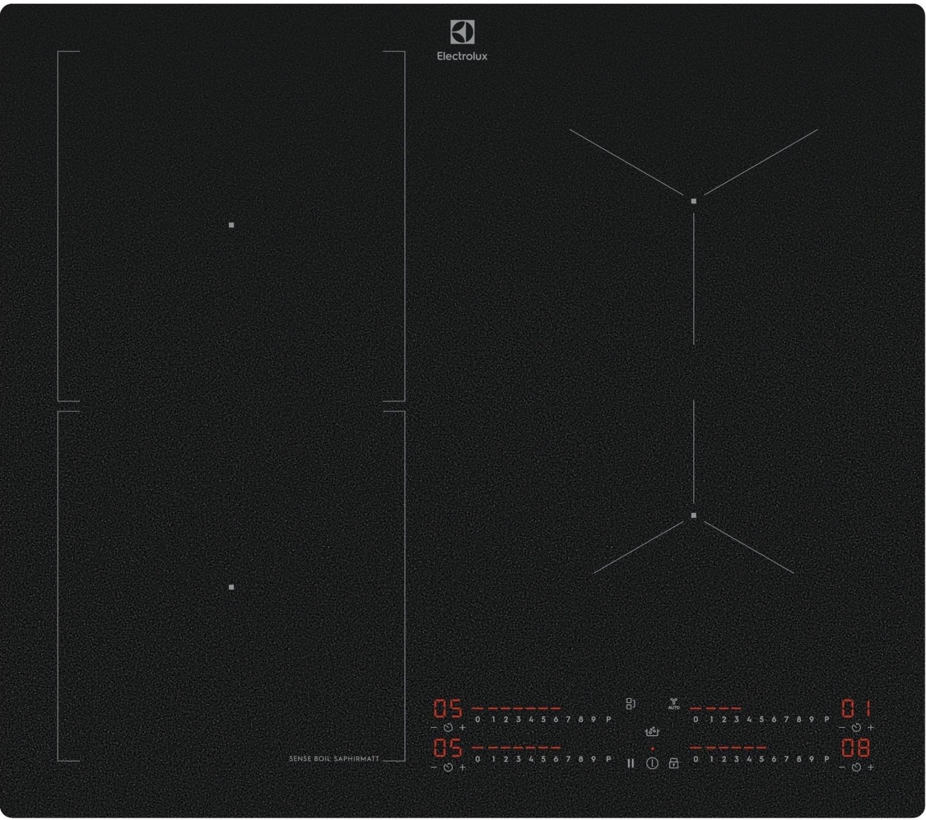 Варильна поверхня Electrolux EIS62453IZ, 60 см, індукційна, 4 зони, SaphirMatt® чорний матовий. Оснащена SenseBoil® для автоматичного контролю кипіння, функцією Bridge для об’єднання зон і Hob2Hood для синхронізації з витяжкою. Забезпечує точне приготування та легке очищення завдяки стійкому до подряпин покриттю.