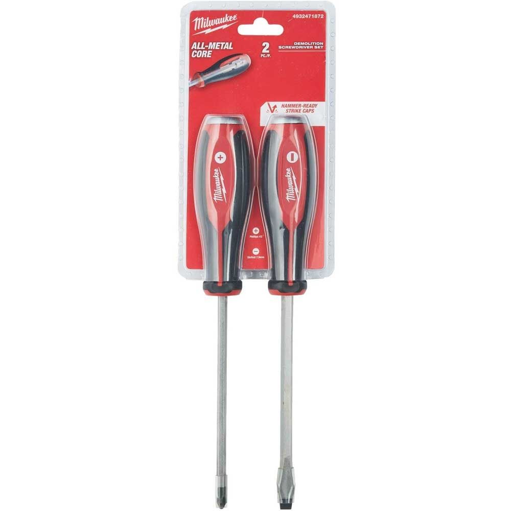 Набір ударних викруток Milwaukee включає два інструменти з профілями PH2 та SL 7.9 мм. Конструкція розрахована на силове відкручування та роботу з ударом. Повністю металева серцевина приймає навантаження і підвищує стійкість до деформації. Шестигранний стрижень дозволяє використовувати гайковий ключ для збільшення крутного моменту.