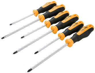 Набір викруток Tolsen Ерго (6 шт.) включає моделі з шліцами PH, SL та PZ. Виготовлені з хром-ванадієвої сталі для надійної роботи, оснащені ергономічними рукоятками GRIPro та намагніченими наконечниками.