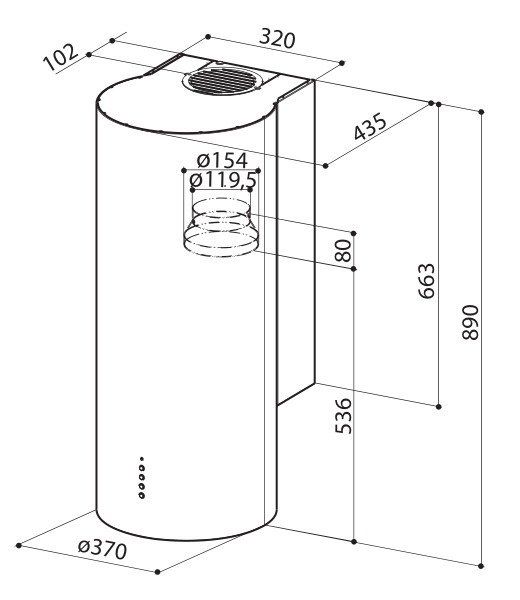 Витяжка оригінальної циліндричної форми призначена для настінного монтажу над невеликими варильними панелями (ширина приладу 37 см). Корпус моделі виготовлено з нержавіючої сталі, його висота становить 89 см. Оснащення витяжного пристрою мотором EVO сприяло підвищенню продуктивності та зниженню рівня шуму. У даній моделі передбачена можливість установки виносного мотора, який може бути розташований в підсобному приміщенні або зовні.