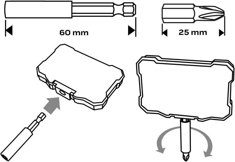 Біти, (25 мм):PH1, PH2, PZ1, PZ2, TX15, TX20, TX25, TX30