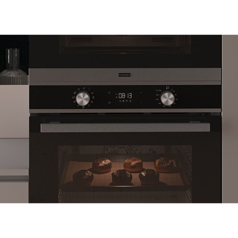 Вбудована електрична духова шафа Franke Smart FSM 97 P XS – преміальне рішення для сучасної кухні з потужним функціоналом та автоматичною системою піролітичного очищення. Просторий корисний об'єм 71 літр та 9 режимів приготування, включаючи спеціальні програми для хліба та десертів, дають змогу готувати будь-які страви на професійному рівні. Піролітичне очищення при температурі понад 400°C спалює жир та забруднення до попелу, який легко видаляється вологою серветкою, економлячи години на ручне миття. Стильний дизайн з поєднанням чорного скла та нержавіючої сталі, сенсорне керування з білим дисплеєм та система плавного закривання дверцят роблять духовку не лише функціональною, але й елегантною деталлю інтер'єру.