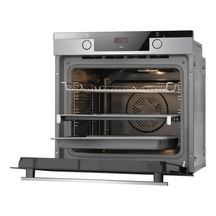 Hansa BOEIS69407 — електрична вбудована духова шафа об'ємом 65 л із класом енергоефективності A та 12 функціями приготування, включно з конвекцією, грилем, режимом піци та SoftSteam. Функція м'якої пари SoftSteam зволожує камеру під час приготування, зберігаючи соковитість страв і скоринку випічки. Сенсорне керування, світлодіодний дисплей, телескопічні напрямні та 5 рівнів випікання забезпечують точний контроль і зручність у щоденному використанні. Тридверне скло та система м'якого закриття підтримують безпеку і комфорт при роботі.