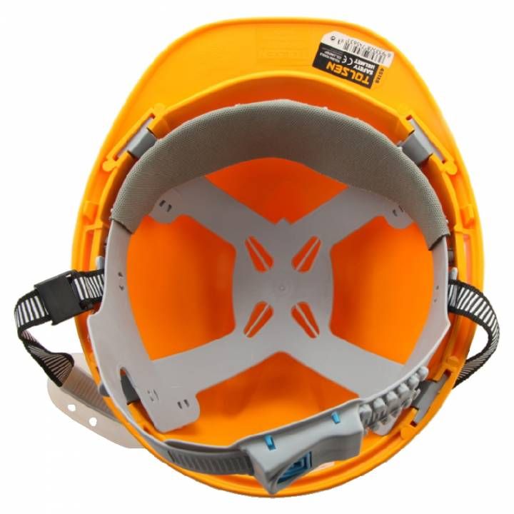 Захисна каска Tolsen забезпечує надійний захист голови під час виконання будівельно-монтажних, промислових або складських робіт. Виготовлена з ударостійкого пластику поліпропілену РР, має регульовану посадку та сумісна з додатковими засобами захисту, такими як щитки та навушники.