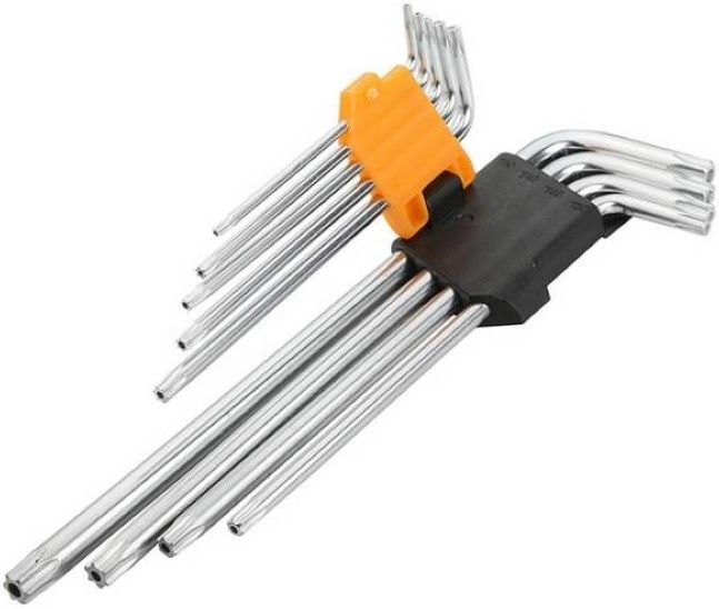 Ключі Tolsen Торкс призначені для закручування/відкручуваня кріпильних елементів з шестигранним шліцем. Конструкцією передбачене довге плече з отвором під стандарт TAMPER TORX, а також фасковані торці, які забезпечують зручну експлуатацію.