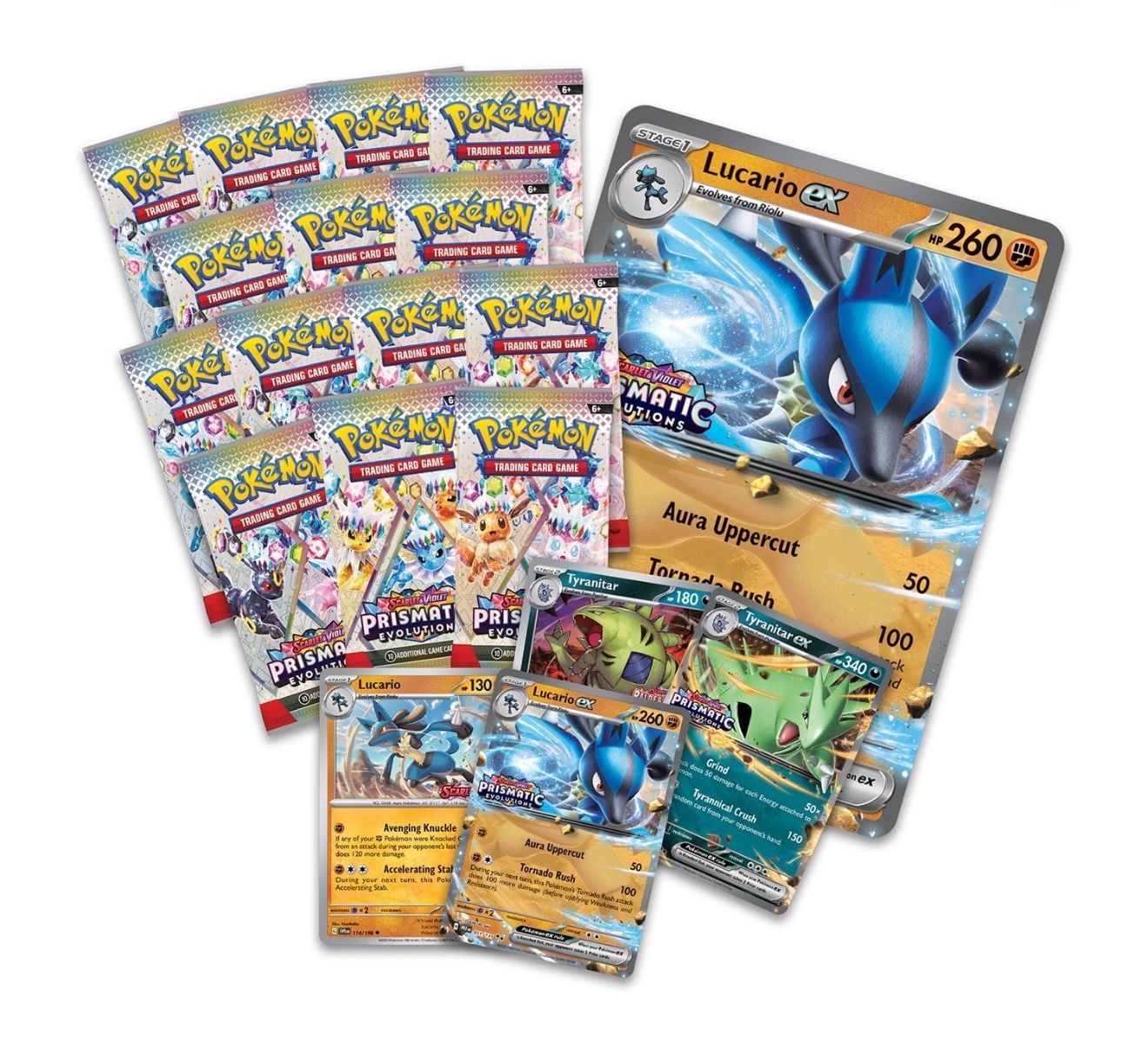 Pokémon Trading Card Game: Scarlet & Violet — Prismatic Evolutions Lucario ex & Tyranitar ex Premium Collection Box — це колекційний набір із серії Scarlet & Violet, призначений для поповнення колекції та використання у форматі Pokémon TCG. Тематика набору зосереджена навколо Lucario ex і Tyranitar ex та містить бустер-паки й промокарти. Формат Premium Collection поєднує колекційні елементи з ігровими картами для розширення колод і подальшої гри. Орієнтований на колекціонування та настільний ігровий процес.
