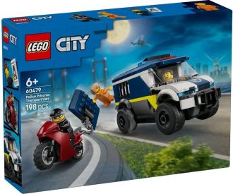 LEGO City Автівки — Поліцейський фургон для перевезення в'язнів (60479) — захопливий набір для дітей від 6 років, що відтворює поліцейський фургон з деталізованою кабіною водія та камерою для ув'язнених на 2 злочинців. Діти можуть використовувати іграшковий мотоцикл з ланцюгом і гаком, щоб витягнути двері камери та влаштувати епічну втечу. У комплекті мініфігурки поліціянта та двох злочинців для сюжетних ігор. Набір розвиває уяву та навички рольової гри. Містить 198 деталей та інструкції в додатку LEGO Builder з 3D-переглядом.