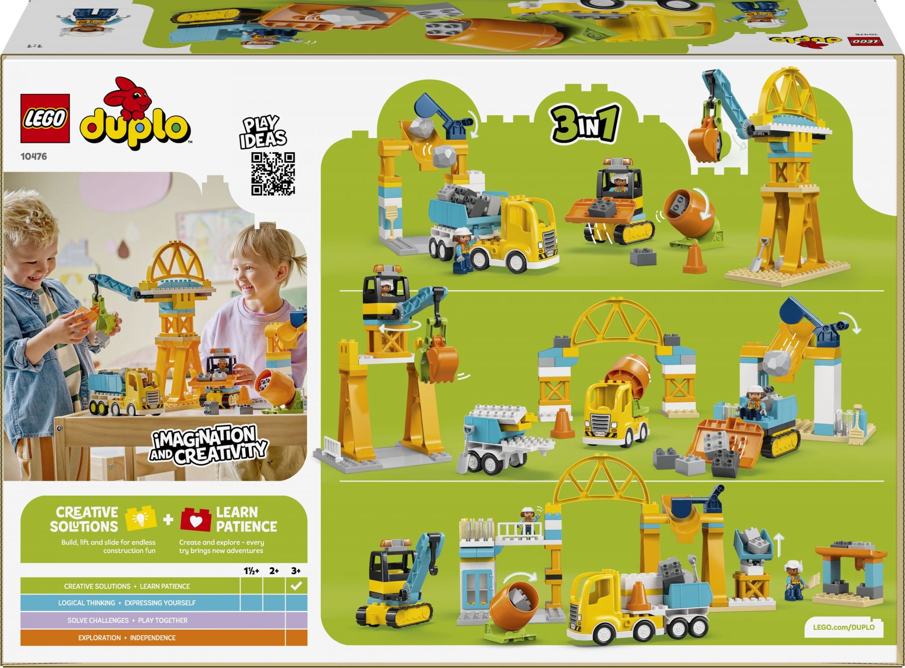 Познайомте маленьких будівельників із набором «3-в-1 Будівельний майданчик і техніка» (10476), де будівництво ніколи не зупиняється! Малюки віком від 3 років занурюються в захопливу будівельну гру, завантажуючи й розвантажуючи вантажівки, піднімаючи та переміщуючи валуни та кубики за допомогою різноманітних будівельних вантажівок LEGO® DUPLO®. Малюки можуть побудувати бульдозер з підйомним ковшем, іграшковий самоскид із функцією перекидання, бетономішалку з барабаном із барабаном, що обертається, а також кран із рухомою стрілою й ковшем на шарнірі. З кубиків також можна побудувати високий кран, завантажувальну станцію, по якій можуть їздити вантажівки, та міст, під яким їздитимуть авто.