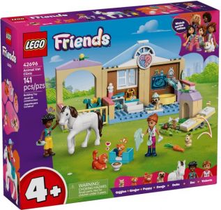 LEGO® Friends 42696 Ветеринарна клініка — набір для дітей від 4 років, який занурює у світ турботи про тварин. Усередині є оглядовий кабінет, конюшня, ігрова зона та багато ветеринарних аксесуарів. У комплекті 2 мініляльки та фігурки коня, собаки, кролика і котів. Великі елементи 4+ полегшують складання, а LEGO Builder допомагає з 3D-інструкціями. 141 деталь для сюжетної гри.
