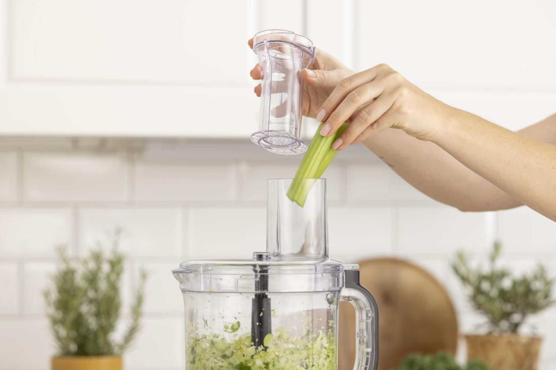 Кухонний комбайн Gorenje 2-в-1 з Fusion Mode: комбайн і блендер в одному, 12 автопрограм (6 кнопок) та 10-швидкісний регулятор. AC-двигун 1500 Вт, чаша 2,0 л, глечик 1,75 л, LED-дисплей. Повний набір насадок, знімні деталі придатні для миття в посудомийці, є блокування та захист від перегріву.