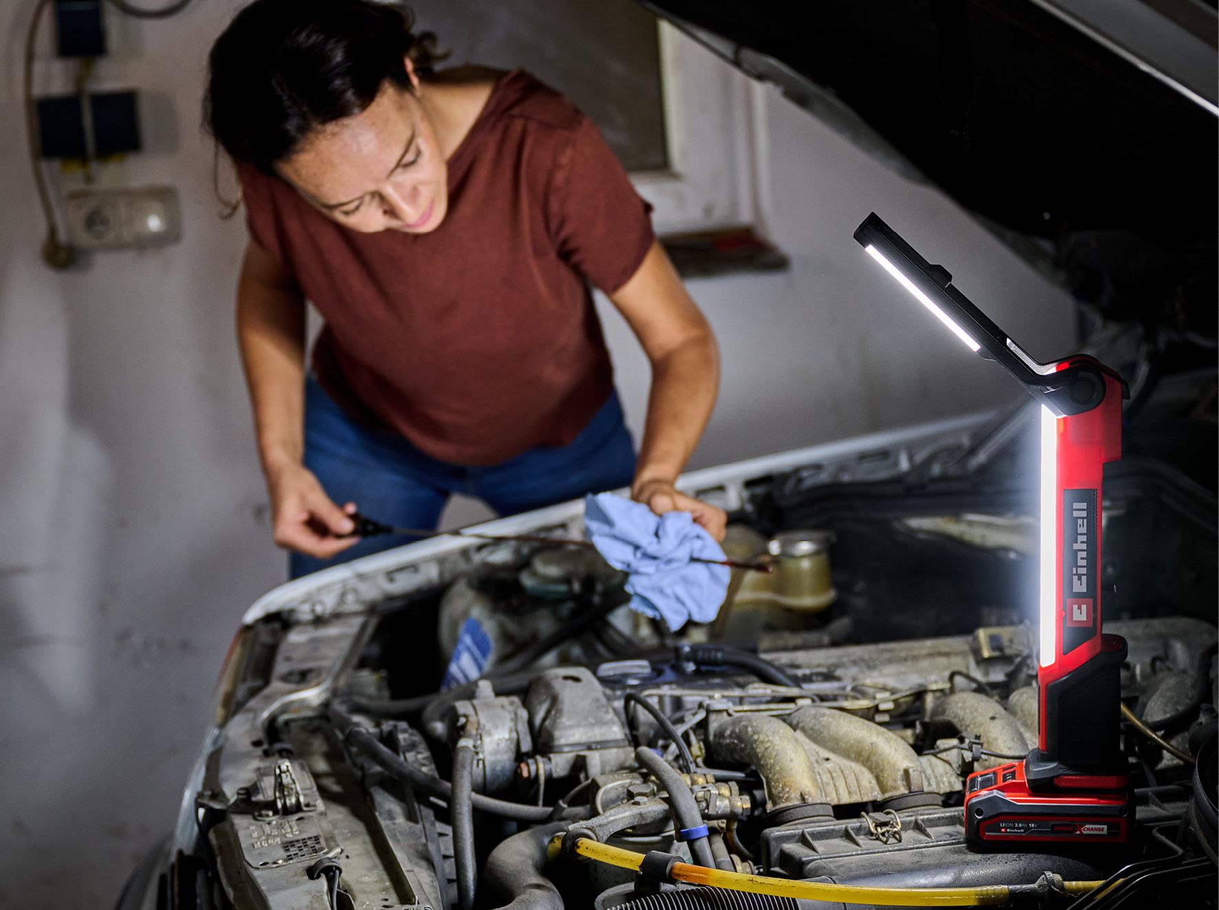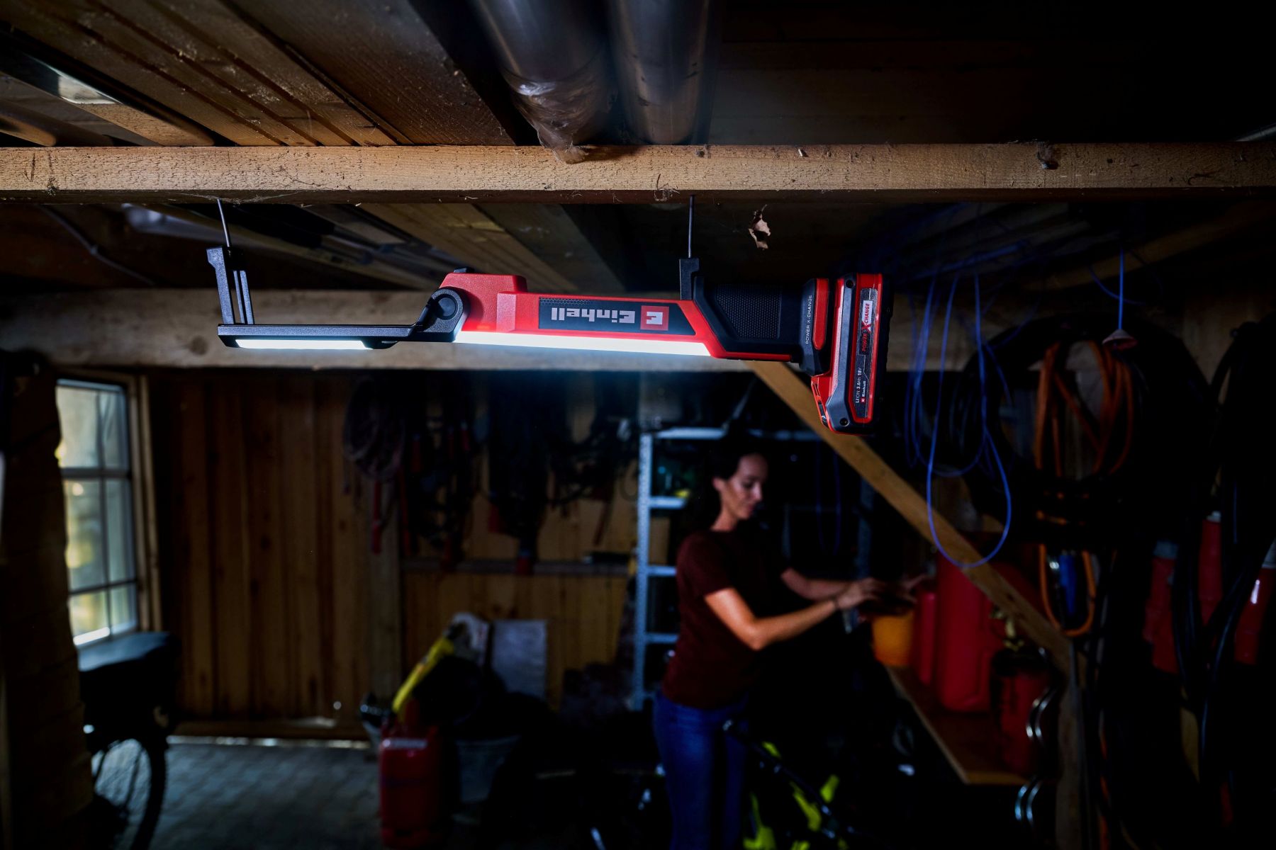Акумуляторний ліхтар Einhell TE-CL 18/1000 S Li-Solo із системи Power X-Change. 15 LED, до 1000 лм, нейтральне світло 5700 К. Три режими: працює одна панель, друга або обидві. Складна регульована головка. Дальність до 5 м. Компактний корпус і ручка з м’яким покриттям. Петлі та гачок для підвішування. Постачається без акумулятора та зарядного пристрою.