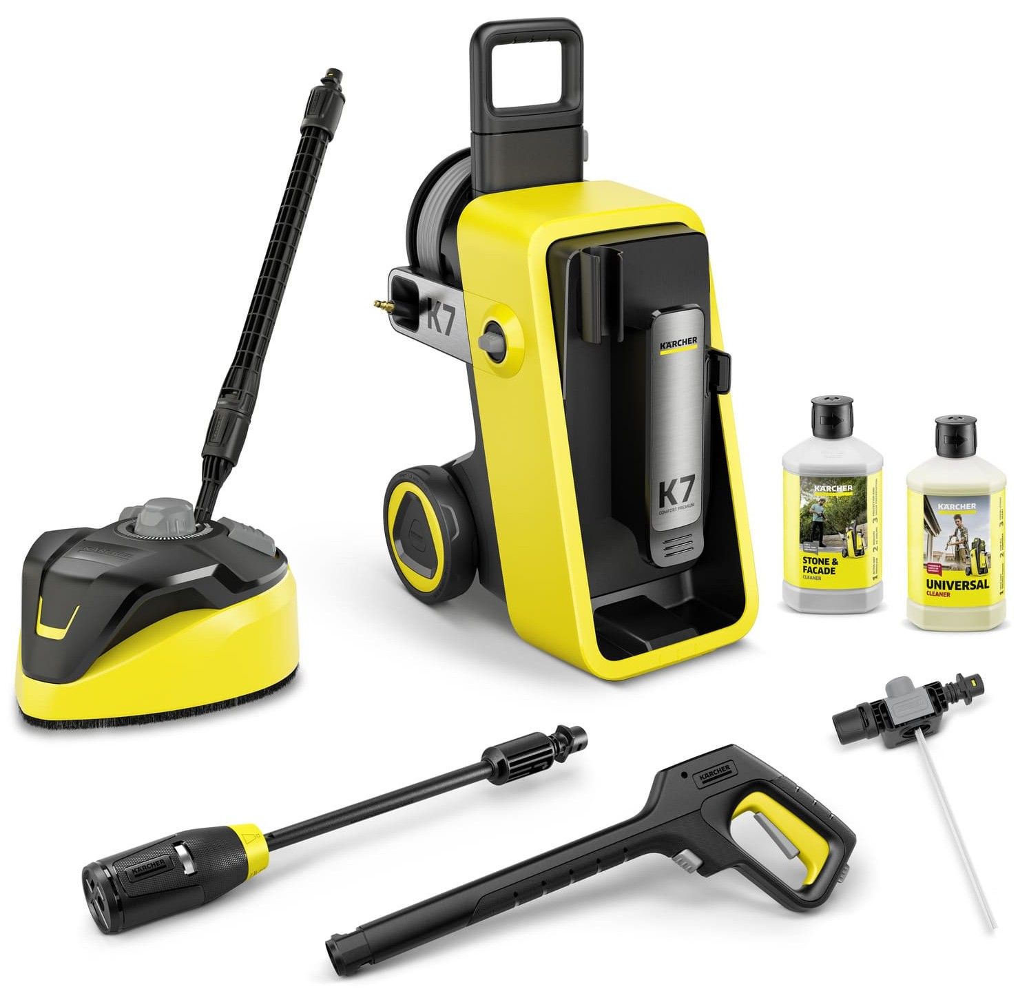 Мінімийка високого тиску Karcher K 7 Comfort Premium Home призначена для очищення автомобілів, фасадів, твердих покриттів і садового інвентарю. Потужний двигун із водяним охолодженням забезпечує стабільну роботу під навантаженням. Конструкція передбачає зручне зберігання аксесуарів і швидке підключення елементів. Система багаторежимного розпилення дозволяє змінювати тип струменя без заміни насадок. Комплект Home орієнтований на обробку великих площ і твердих поверхонь.