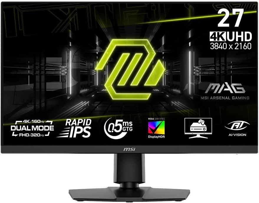 Монітор MSI MAG 272URDF-E16 — 27-дюймовий Rapid IPS-екран з роздільною здатністю 3840x2160, частотою 160 Гц, часом відгуку 0.5 мс, охопленням sRGB 131%, FreeSync, Pivot та HDR400. Подвійний режим (Dual Mode) для перемикання між UHD@160Hz та FHD@320Hz, підключення 2x HDMI, DP, 2x USB, аудіо. Чудово пасує для ігор з плавними кадрами та точними кольорами.