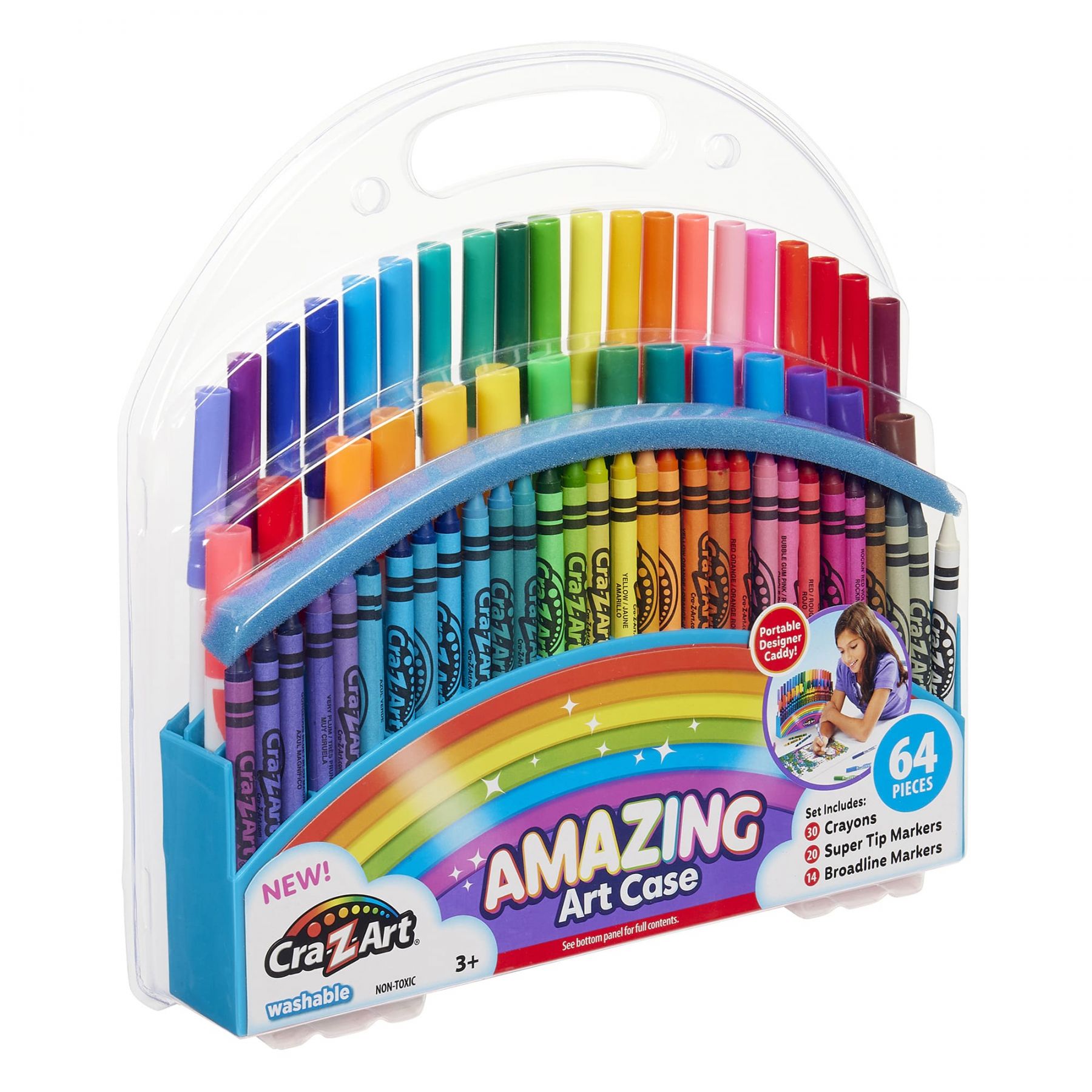 Набір для творчості Cra-Z-Art у кейсі на 64 предмети використовується для малювання та розфарбовування. Набір містить воскові крейди та маркери з різними типами наконечників для створення деталей і кольорових заливок. Комплект розміщений у пластиковому кейсі для зручного зберігання та транспортування. Такий формат набору дозволяє використовувати художні інструменти під час творчих занять удома або в дорозі.
