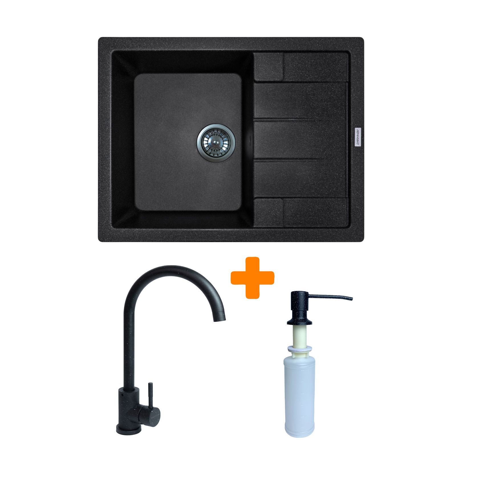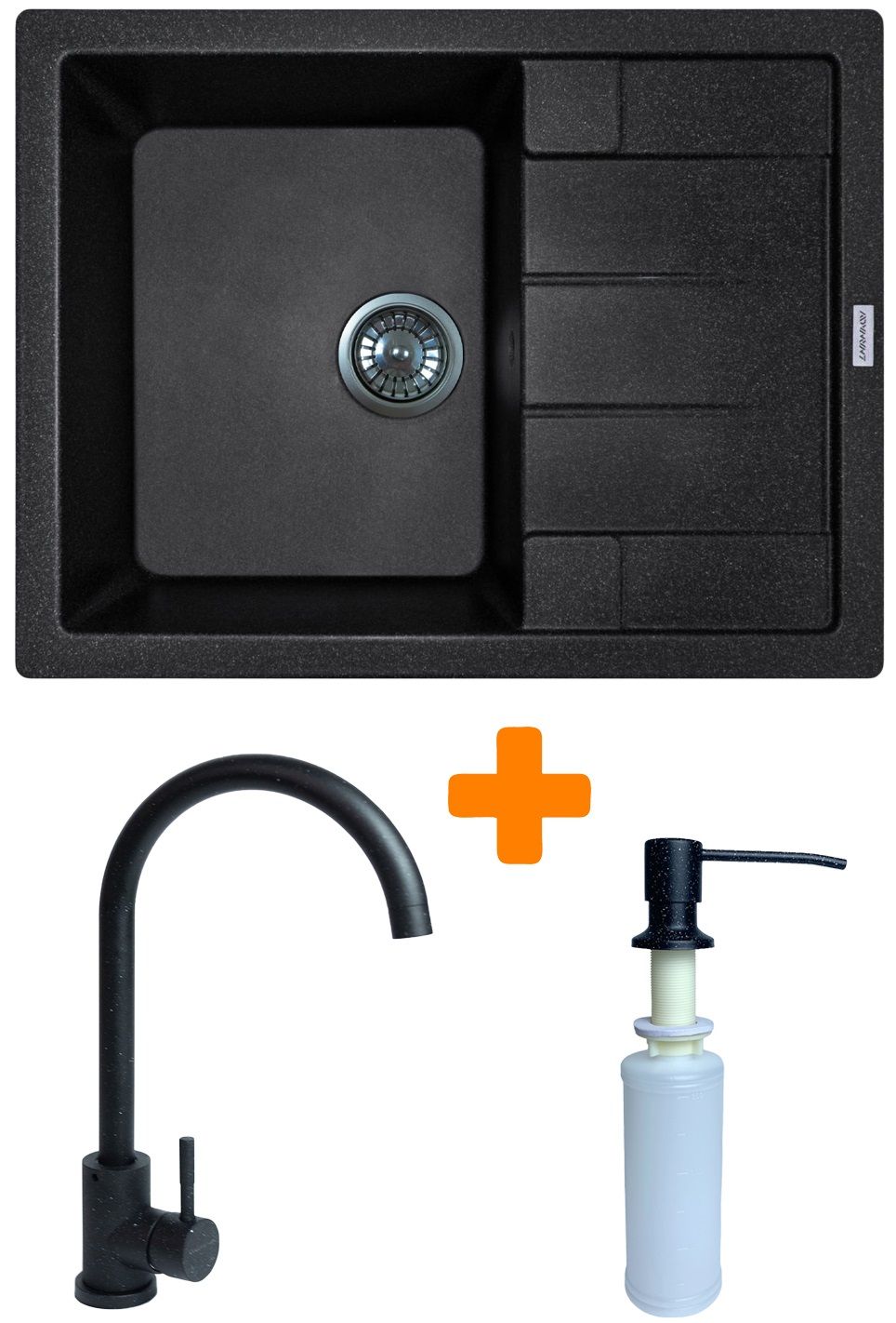 Набір кухонний Adamant Anila, штучний камінь, прямокут., з крилом, 645х495х200мм, чаша - 1, врізна, чорний + змішувач та дозатор
