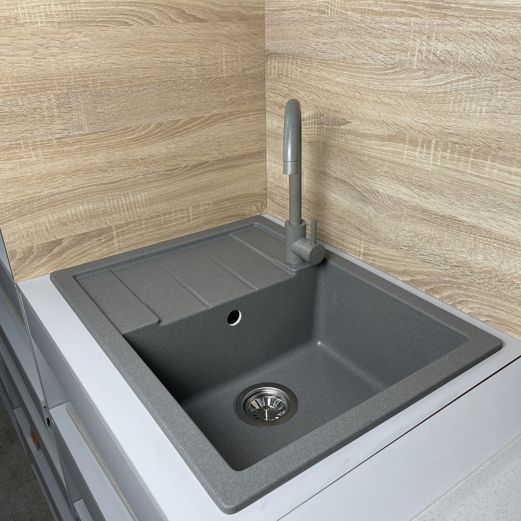 Кухонний набір Adamant Anila поєднує містку мийну зі штучного мінерального матеріалу, змішувач та вбудований дозатор миючого засобу. Прямокутна форма з крилом забезпечує зручність у щоденній роботі й дозволяє раціонально організувати робочий простір. Матеріал мийки стійкий до температур, подряпин і дії побутової хімії, а непориста поверхня легко очищується. Змішувач виготовлений із безпечних довговічних матеріалів і забезпечує плавне керування водою. Дозатор додає комфорту, позбавляючи від зайвих пляшок на стільниці.