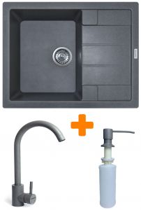 Набір кухонний Adamant Anila, штучний камінь, прямокут., з крилом, 645х495х200мм, чаша - 1, врізна, сірий + змішувач та дозатор