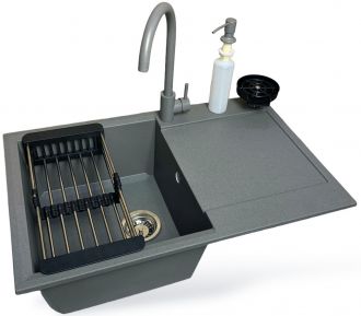 Набір кухонний Adamant Horizon, штучний камінь, прямокут., з крилом, 780х495х230мм, чаша - 1, врізна, сірий + змішувач та дозатор