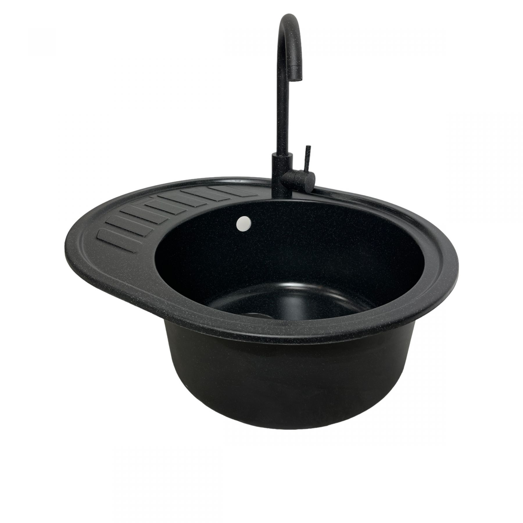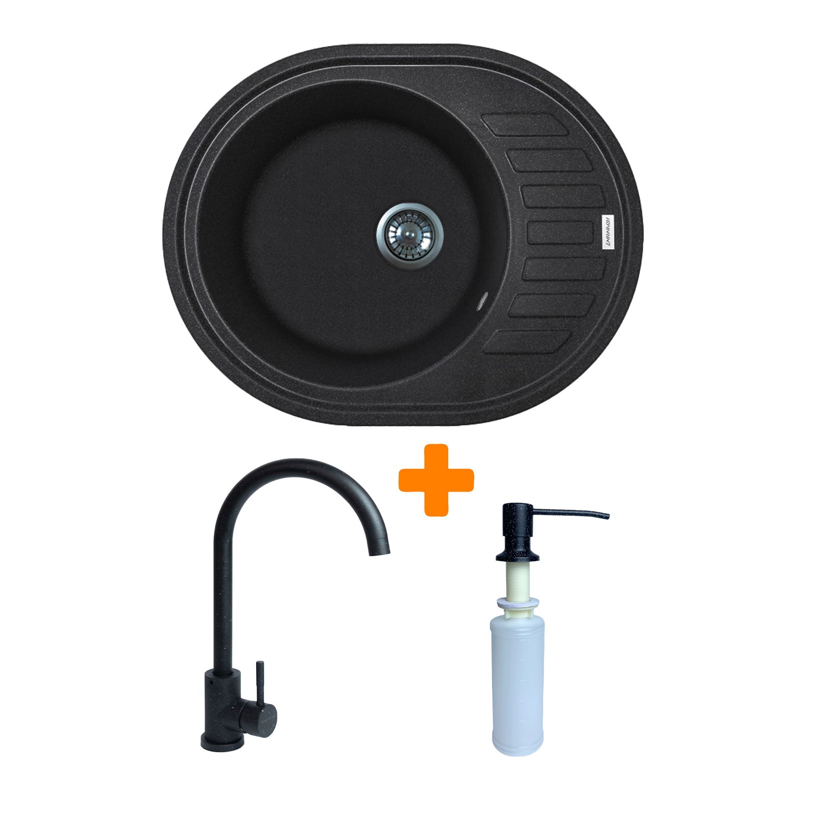 Набір кухонний Adamant Ovum, штучний камінь, овальна, з крилом, 615х495х200мм, чаша - 1, врізна, чорний + змішувач та дозатор
