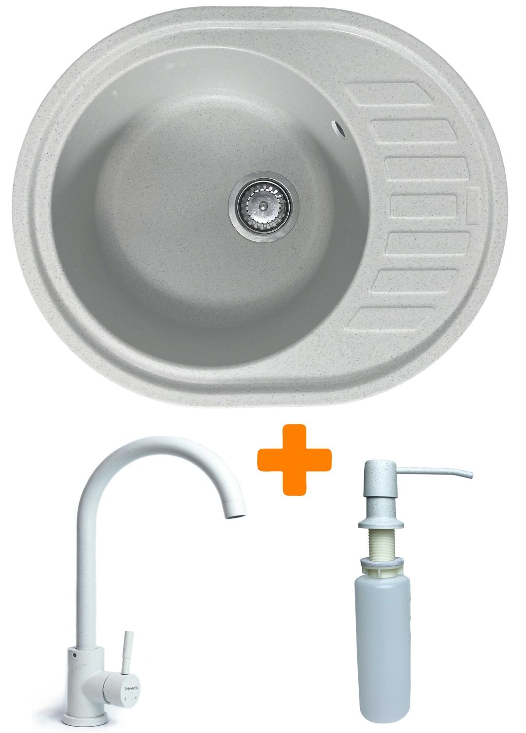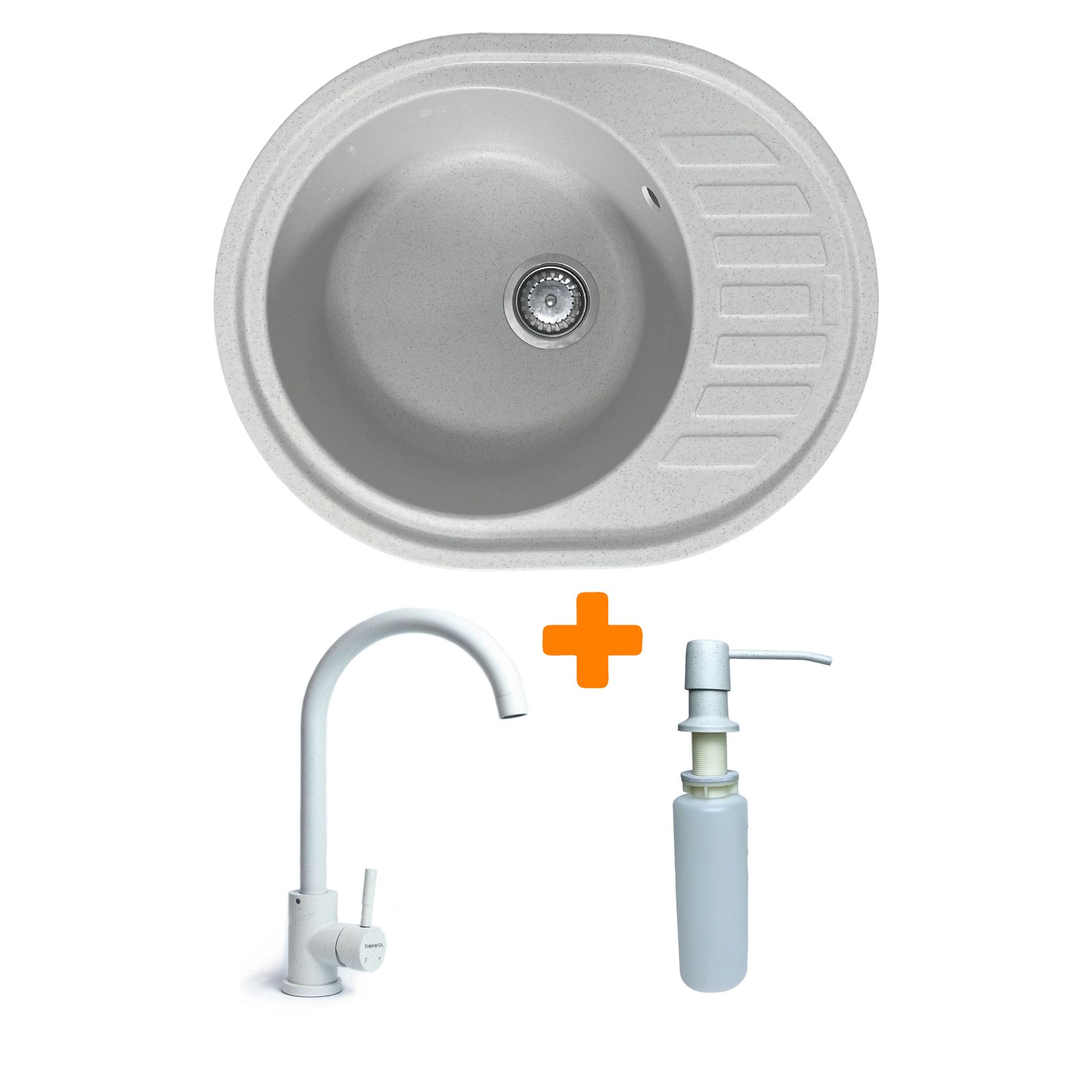 Набір кухонний Adamant Ovum, штучний камінь, овальна, з крилом, 615х495х200мм, чаша - 1, врізна, Old stone + змішувач та дозатор