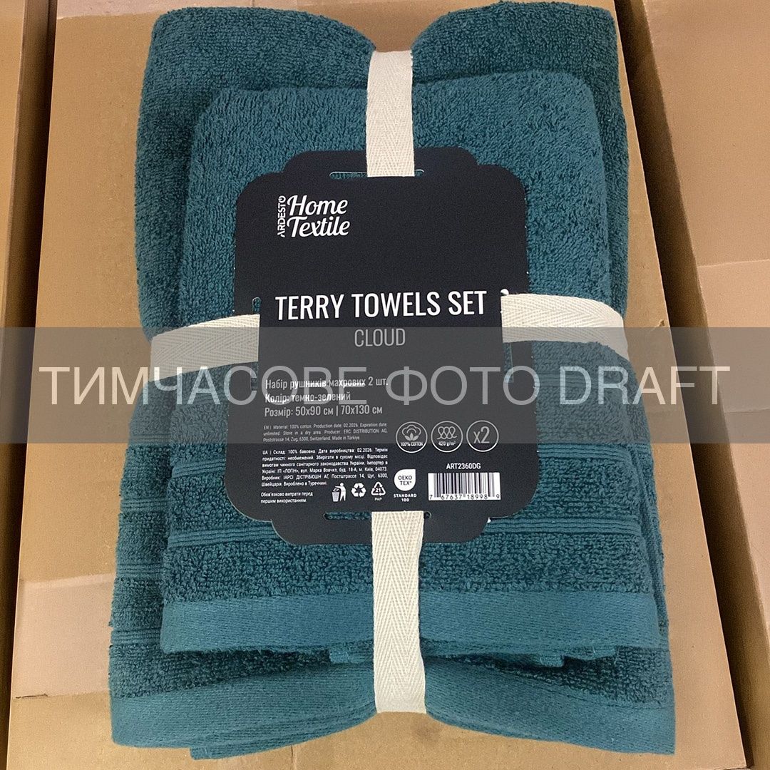 Набір рушників махрових ARDESTO Cloud 50х90см, 70х130см, 2шт, 100% бавовна, зелений темний