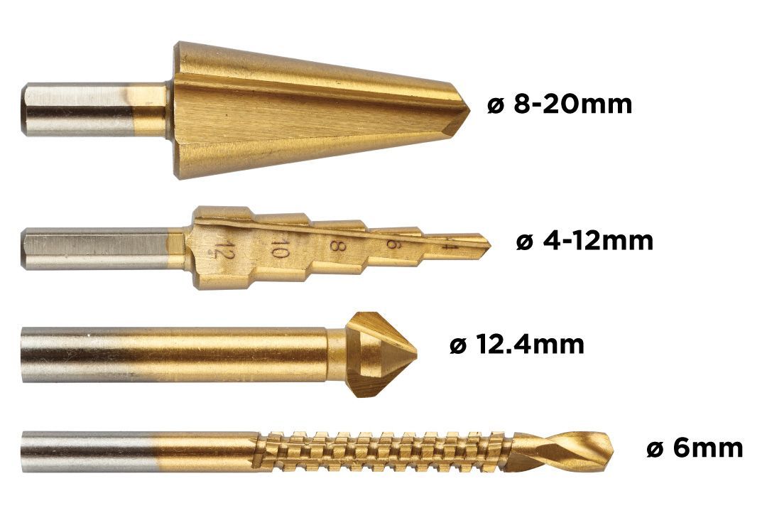 Набір GRAPHITE поєднує чотири інструменти для свердління та точної доробки отворів у металі, пластику та дереві. Покриття TiN підвищує зносостійкість і забезпечує стабільну роботу навіть за інтенсивного використання. Комплект зручний для акуратного розширення отворів, зняття фасок і чистової обробки країв.