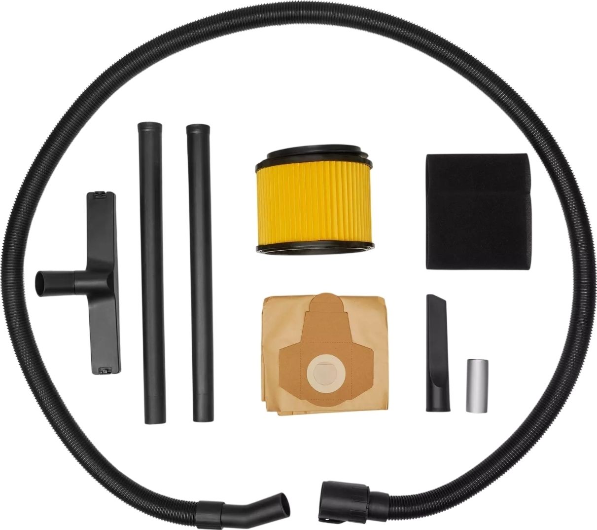 Комплектація:інструкція, Гарантійний талон, щілинна насадка, пилосос, поролоновий фільтр для вологого прибирання, гофрований фільтр для сухого прибирання, паперовий мішок для збору пилу, всмоктувальний шланг 2,5 м Ø 36 мм, двосекційна всмоктувальна трубка, комбінована насадка для килимів і гладких підлог
