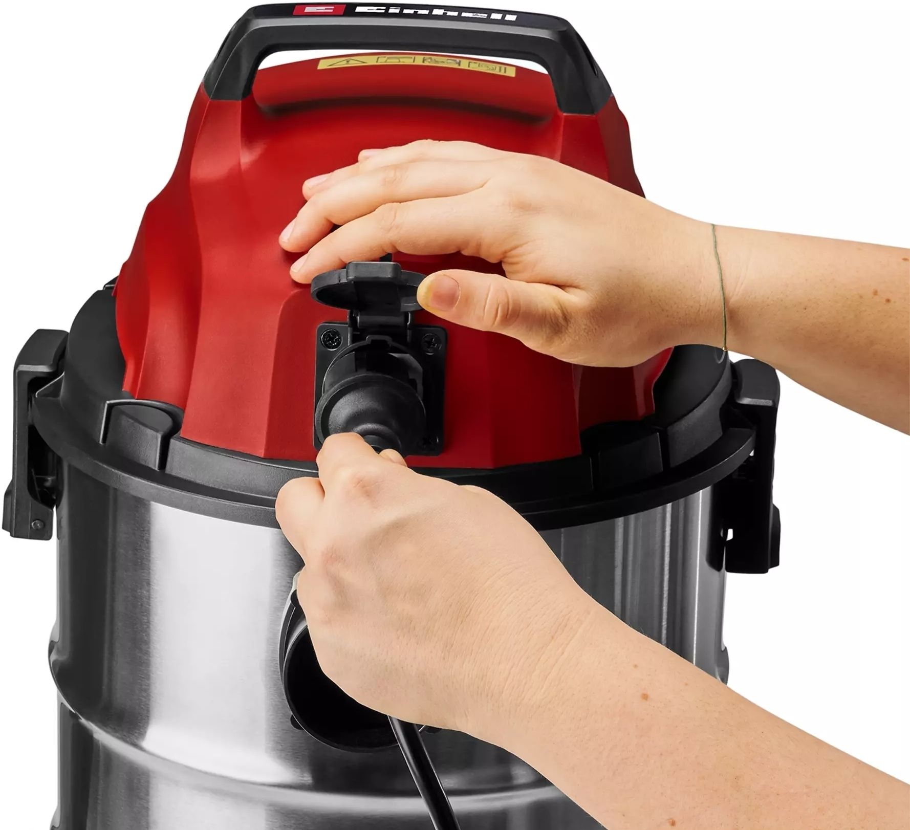 Einhell TC-VC 3055 SA — професійний пилосос для вологого та сухого прибирання з двигуном 900 Вт і силою всмоктування 190 мбар. Бак із нержавіючої сталі об'ємом 30 л витримує як рідини, так і будівельне сміття, а функція видування спрощує очищення важкодоступних місць. Автоматична розетка на 2000 Вт вмикає та вимикає пилосос разом із підключеним електроінструментом. Шланг 2,5 м і кабель 3 м забезпечують радіус дії 5,5 м.