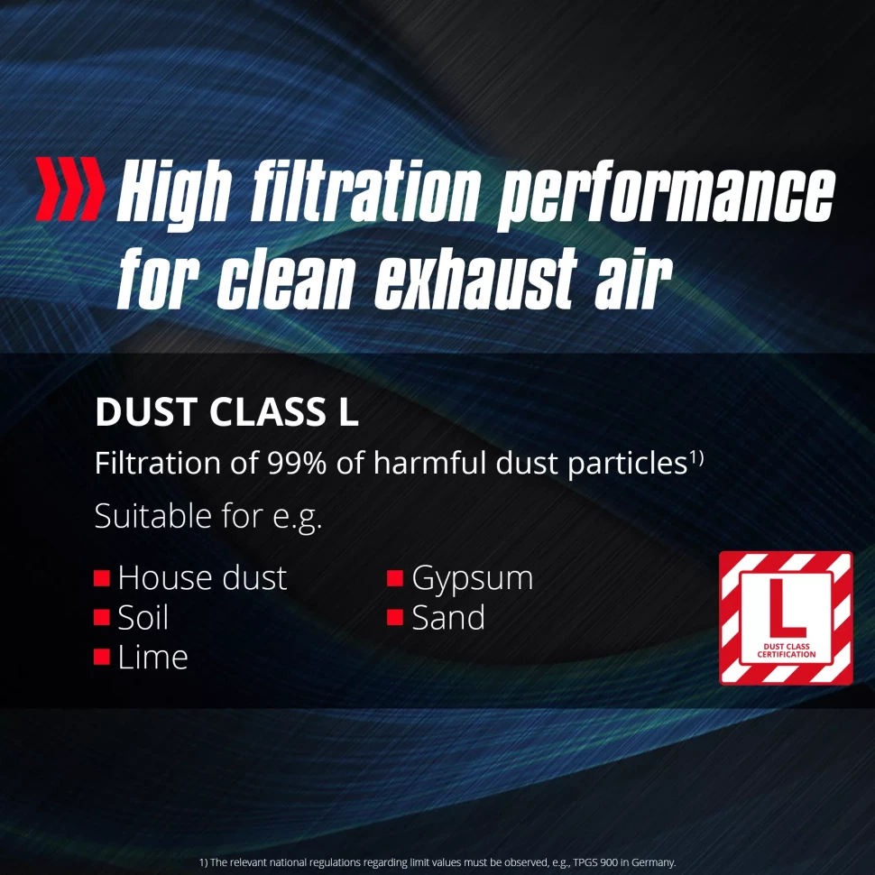 Функціональні:система очищення фільтра одним натисканням кнопки, автоматична розетка для підключення електроінструменту, функція видування, клас захисту від пилу L (Euronorm)