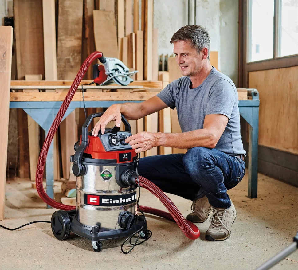 Einhell TE-VC 2580 SACL — професійний пилосос для вологого та сухого прибирання з двигуном 1100 Вт і силою всмоктування 200 мбар. Бак із нержавіючої сталі об'ємом 25 л витримує як рідини, так і будівельний пил класу L — штукатурку, вапно, пісок і ґрунт. Гофрований HEPA-фільтр затримує найдрібніші частинки, а система очищення фільтра одним натисканням кнопки відновлює максимальну потужність всмоктування. Шланг 3 м і кабель 5 м забезпечують радіус дії 8 м.