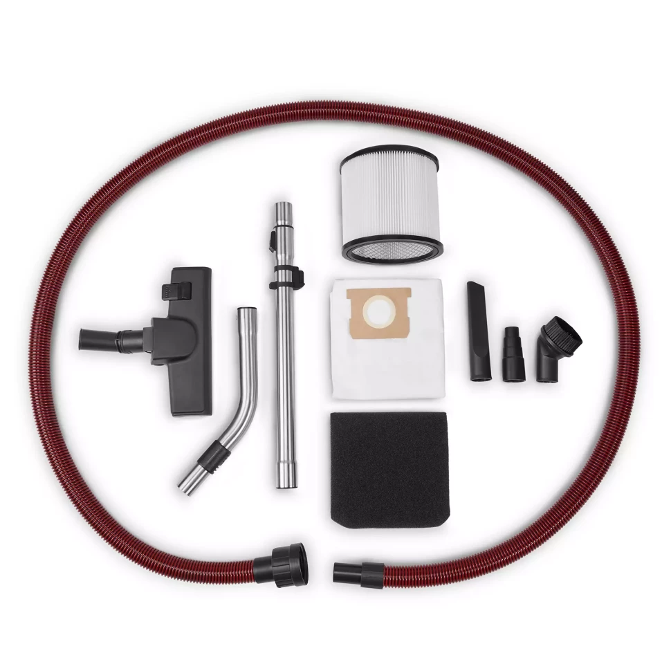 Комплектація:інструкція, Гарантійний талон, щілинна насадка, насадка для оббивки, пилосос, поролоновий фільтр для вологого прибирання, гофрований HEPA-фільтр, синтетичний мішок для сухого прибирання, всмоктувальний шланг 3 м Ø 36 мм, комбінована насадка з роликами