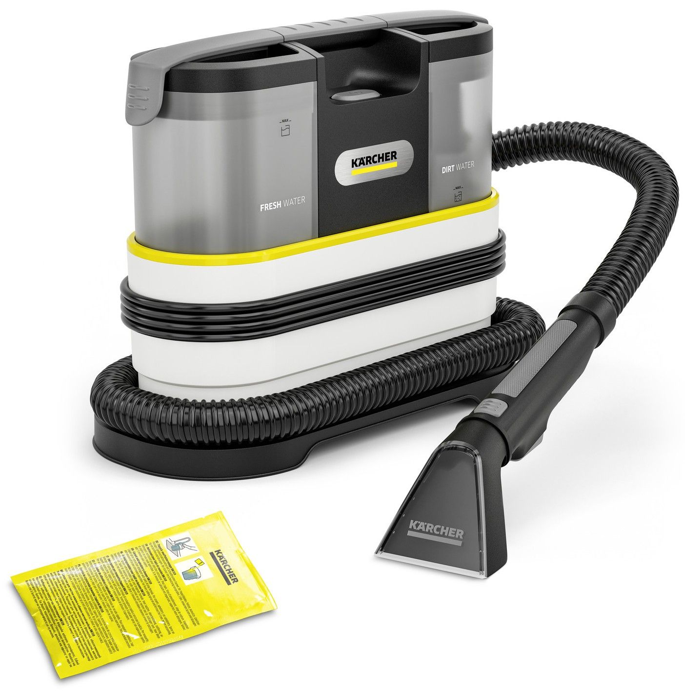 Kärcher SE 2 Spot — компактний миючий пилосос для локального очищення плям і запахів з м’яких меблів, килимів та інших текстильних поверхонь. Прилад подає миючий розчин безпосередньо на забруднення і одразу збирає його разом з брудною рідиною, завдяки чому тканина очищується у глибині волокон і швидше висихає. Компактна конструкція, мала вага та зручне зберігання роблять його зручним рішенням для щоденного догляду за текстильними поверхнями.