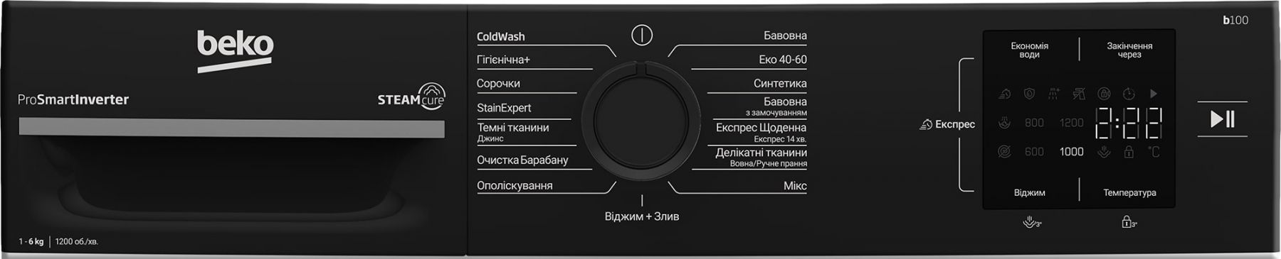 Програми:Бавовна, Синтетика, Мікс, StainExpert, ополіскування, Еко 40-60, Експрес Щоденна/Експрес 14 хв, Темний одяг/Джинси, Гігієнічна+, Сорочки, Віджим + Злив, Прання в холодній воді, Делікатні тканини /Вовна/Ручне прання, Бавовна із попереднім замочуванням, Очищення барабану