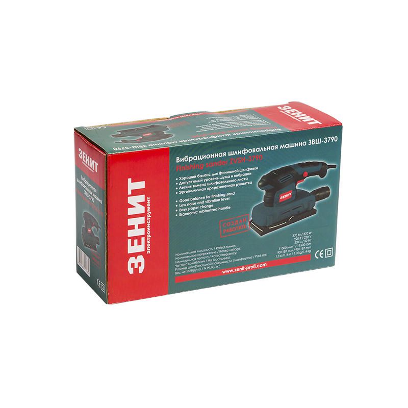 Вібраційна шліфмашина Зеніт ЗВШ-3790 потужністю 370 Вт оснащена платформою 90×187 мм і працює з частотою вібрації 11500 хв⁻¹. Інструмент призначений для фінішного шліфування деревини, шпаклівки, металу та інших матеріалів перед фарбуванням чи лакуванням. Гумова накладка на рукоятці та мала вага 1,4 кг забезпечують зручне утримання та контроль під час роботи. Швидка заміна шліфувального листа виконується без інструментів.
