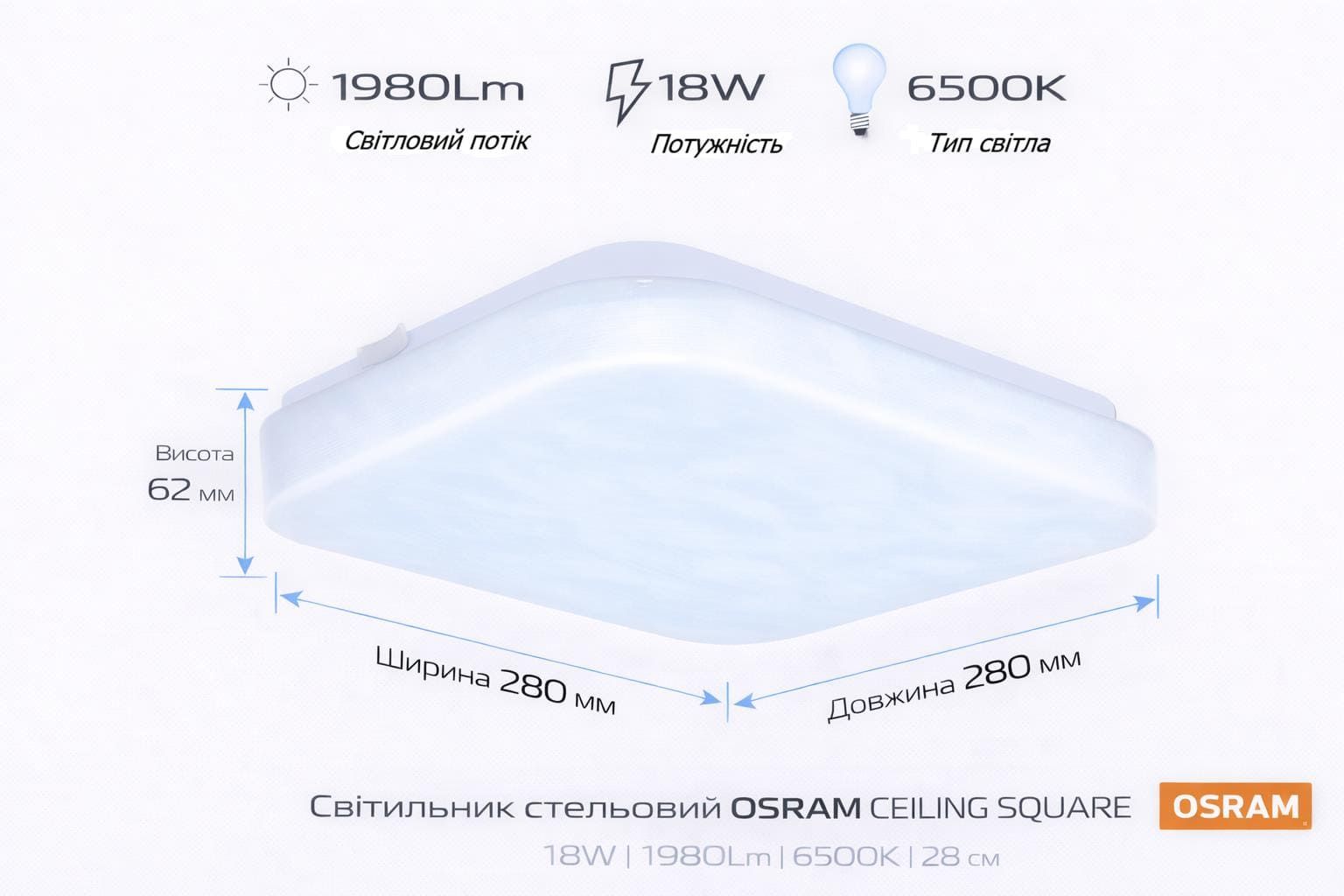 Світильник стельовий OSRAM CEILING SQUARE — накладна модель квадратної форми для загального освітлення приміщень середньої площі. Інтегрований LED-модуль формує рівномірне холодне світло з температурою 6500 K. Світловий потік 1980 лм забезпечує базовий рівень освітлення для повсякденного використання. Кут розсіювання 120° забезпечує рівномірне покриття простору.