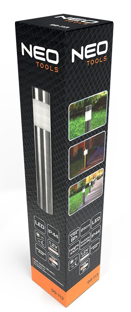 Світлодіодний садовий стовп NEO TOOLS використовується для освітлення садових і прибудинкових територій. Конструкція виконана з нержавіючої сталі та розрахована на використання на відкритому повітрі. Живлення здійснюється від сонячної панелі без підключення до електромережі. Вбудований датчик освітлення забезпечує автоматичне вмикання в темний час доби. Колірна температура 8000 К формує холодний спектр світла.