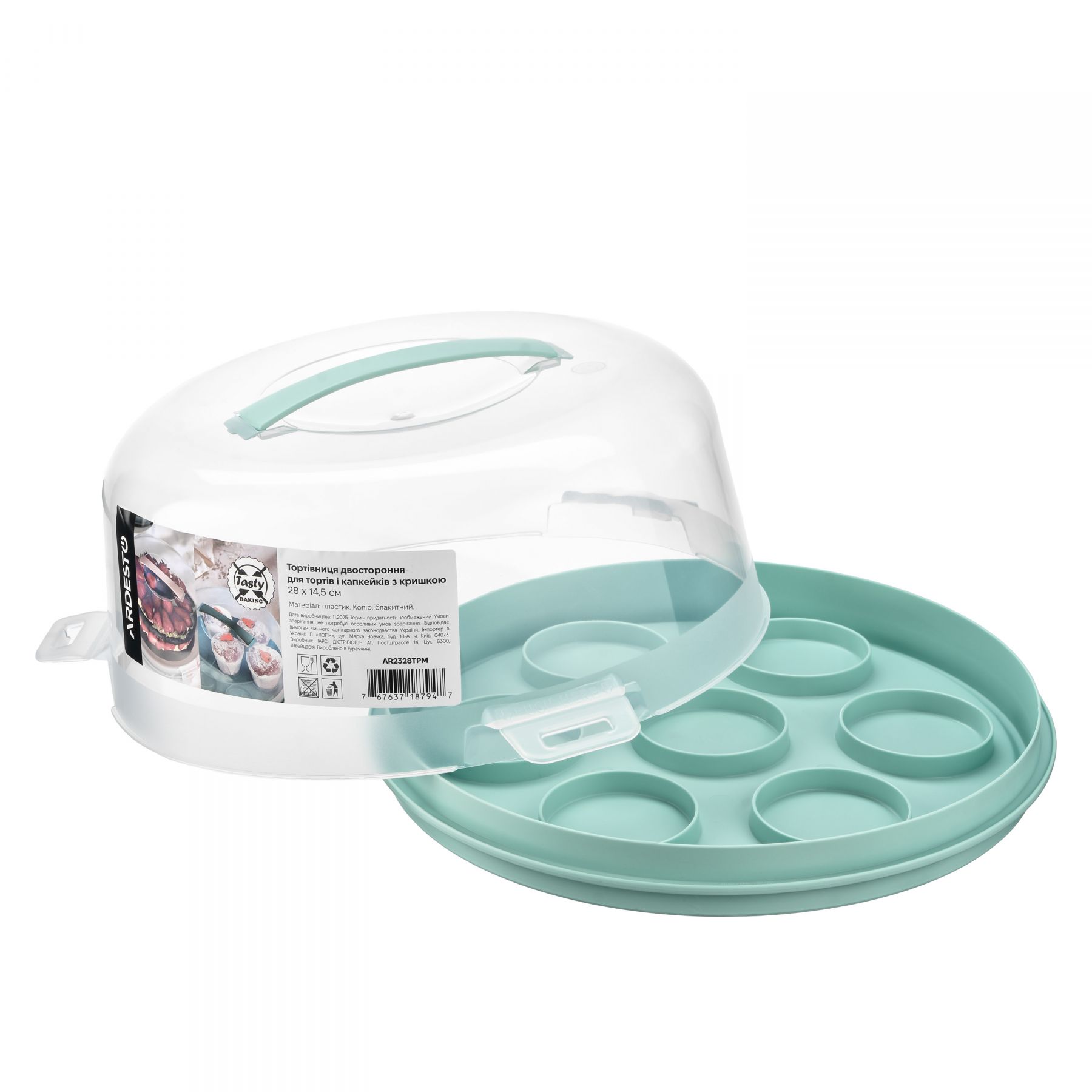 Тортівниця двостороння для тортів і капкейків з кришкою ARDESTO Tasty baking, 28х14.5см, пластик, блакитний