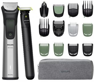 Philips Series 9000 з 17 інструментами та насадками створений для догляду за обличчям, волоссям і тілом. Леза зі сталі із самозаточуванням та технологія OneBlade забезпечують чисте й точне підстригання. Тример підтримує регулювання довжини з кроком 0,2 мм, а BeardSense автоматично підлаштовується під густоту волосся. Пристрій працює до 120 хвилин без підзарядки, водонепроникний та зручний у подорожах.