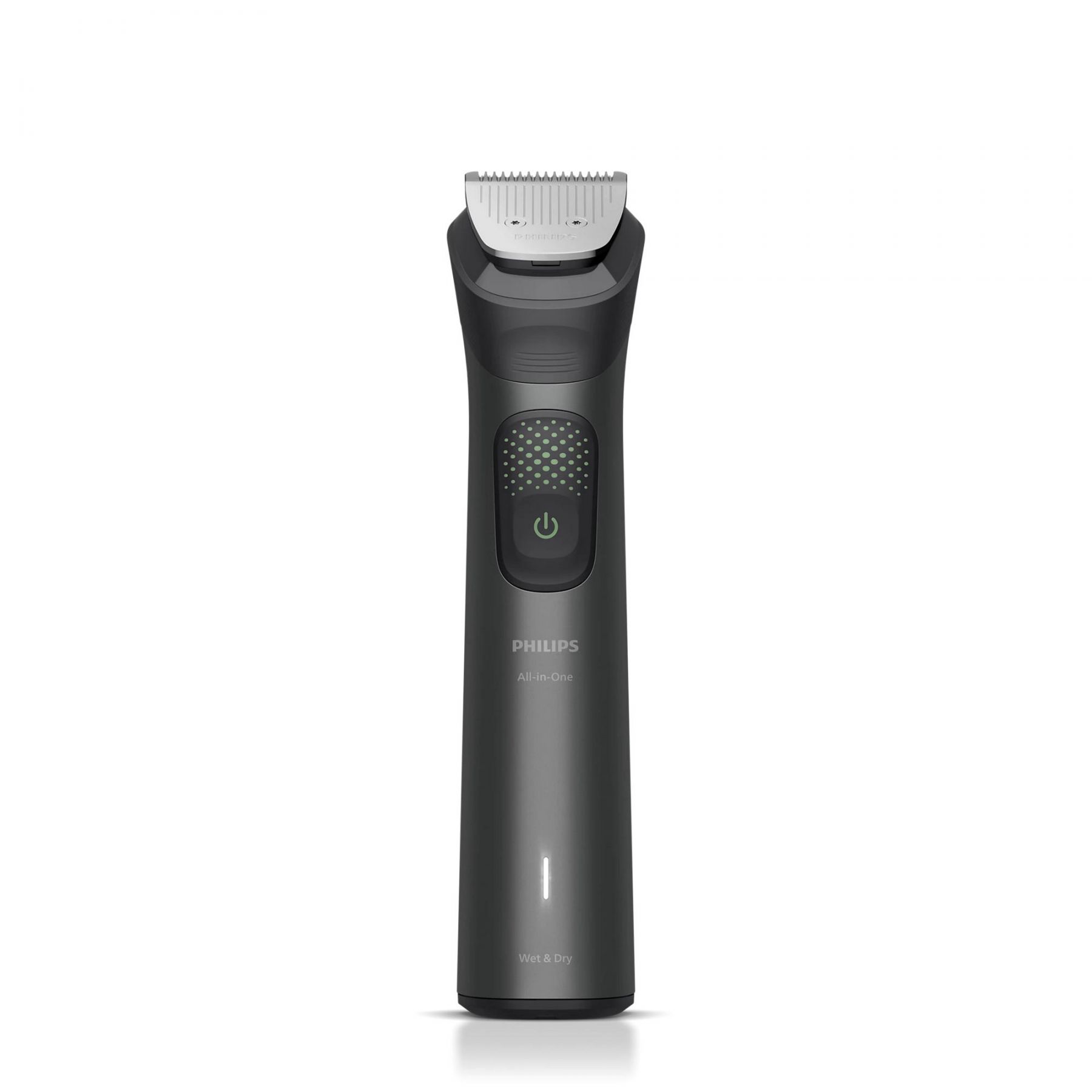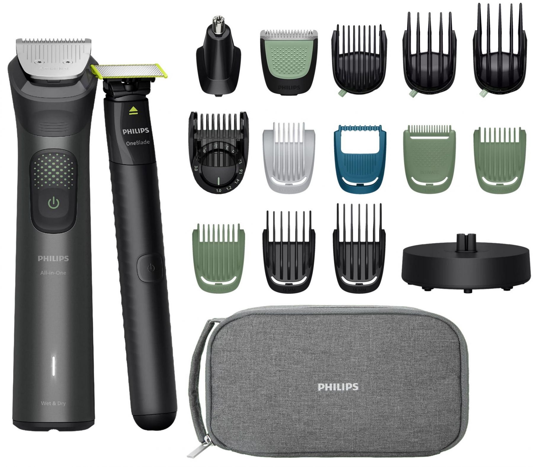 Philips Series 9000 — це універсальний тример для обличчя, голови та тіла з 19 інструментами й насадками. Завдяки технології BeardSense він адаптується до густоти волосся, забезпечуючи рівномірне підстригання. Леза із самозаточуванням і OneBlade гарантують точність і комфорт. Пристрій працює до 120 хвилин від одного заряду та повністю водонепроникний.