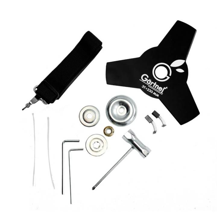 Комплектація:документація, захисний кожух, упаковка, передня рукоятка, наплічний ремінь, тример садовий, Ріжучий ніж з трьома лезами, комплект інструменту для складання/регулювання, ріжуча головка з жилкою, комплект фіксуючих елементів та ніж кожуха для жилки