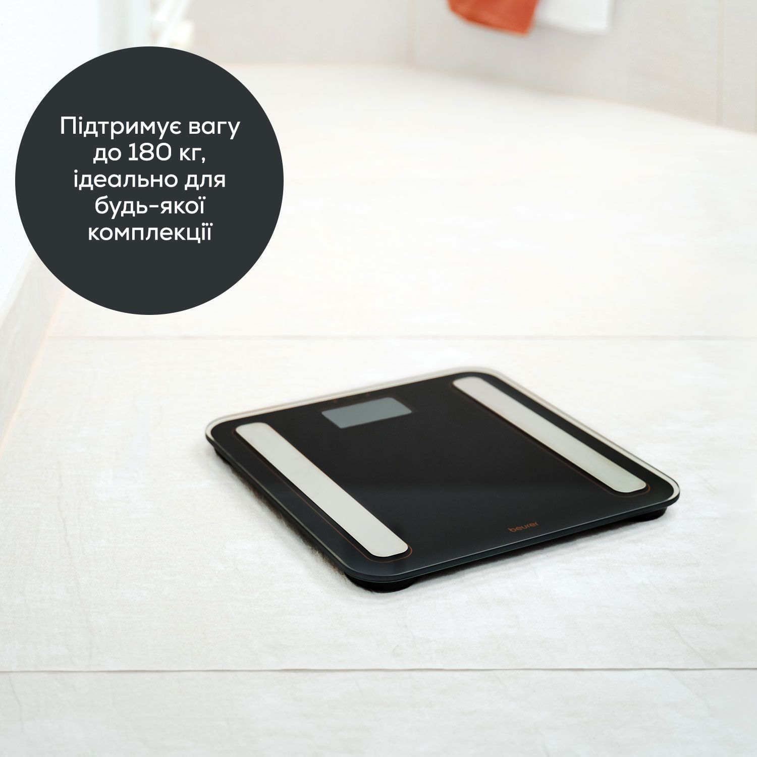 Підлогові смарт ваги, що поєднують стильний дизайн та точність. Визначають вагу та аналізують склад тіла, включаючи вісцеральний жир та метаболічний вік. Максимальна вага до 180 кг, зручно для користувачів різної комплекції. Великий дисплей забезпечує легке читання результатів. Ваги мають пам’ять на 10 користувачів для зберігання даних. Автоматичне ввімкнення спрощує користування.