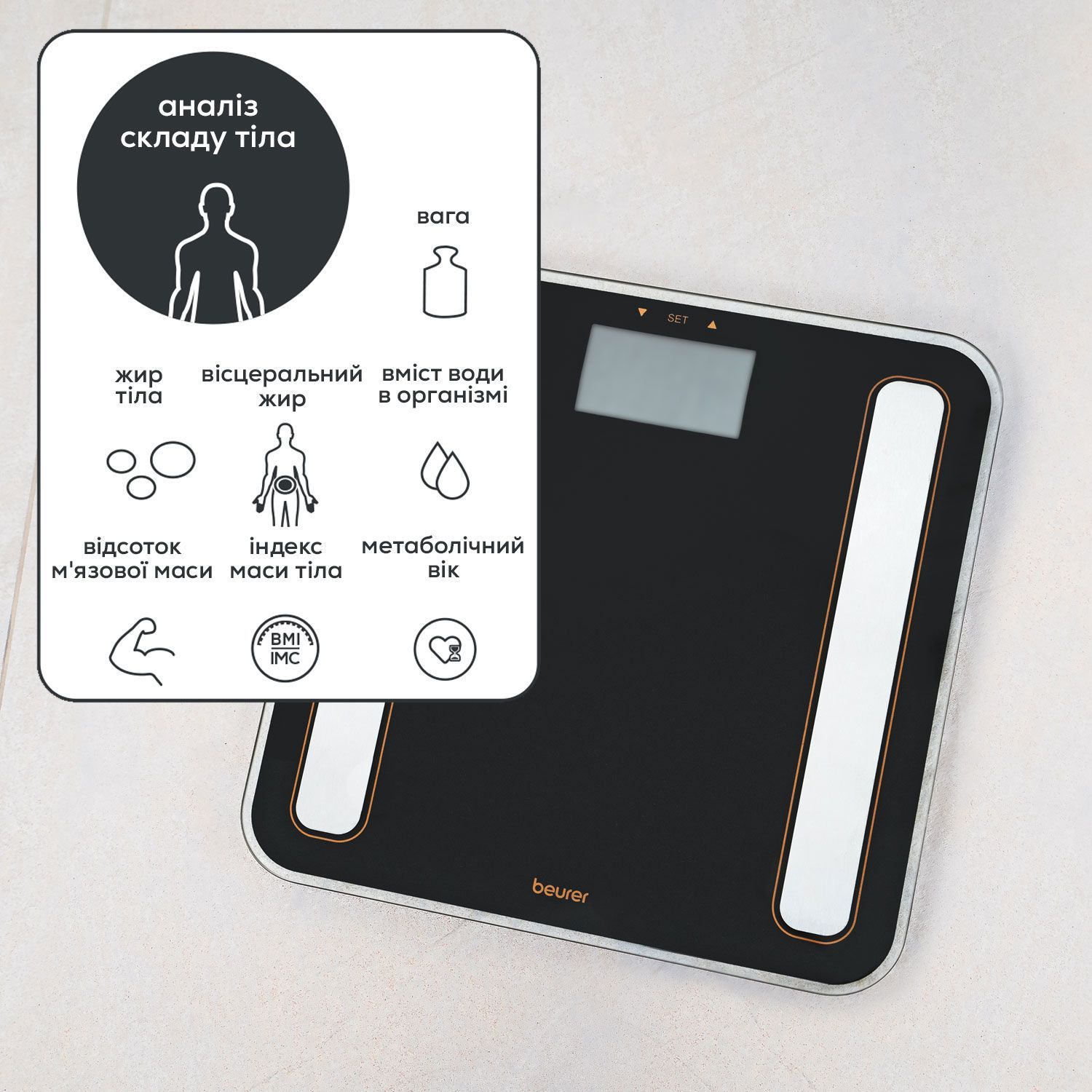 Ваги Beurer підлогові діагностичні, 180кг, підсвіч., дисплея, 1хCR2032, скло,чорний