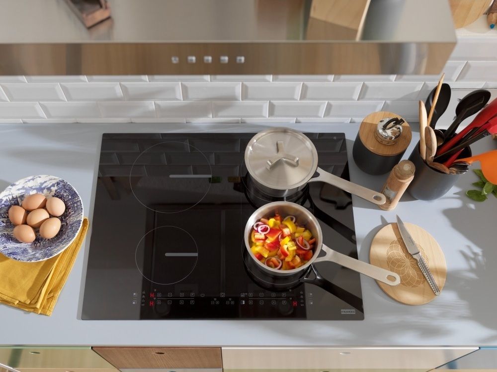 Franke FSM 654 I B BK — індукційна варильна поверхня шириною 60 см з 4 зонами нагріву, сенсорним слайдер-керуванням та функцією Bridge для об’єднання зон. Підтримує 9 рівнів потужності + бустер на кожній зоні (макс. 3000 Вт), обмеження загальної потужності (2,5–7,2 кВт), функції підтримання тепла, тушкування, плавлення, кипіння. Внутрішнє скло чорне, без рамки, номінальна потужність 7,2 кВт. Є блокування панелі управління та таймер. Підходить для вбудовування в стільницю стандартним або врівень монтажем.