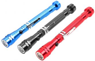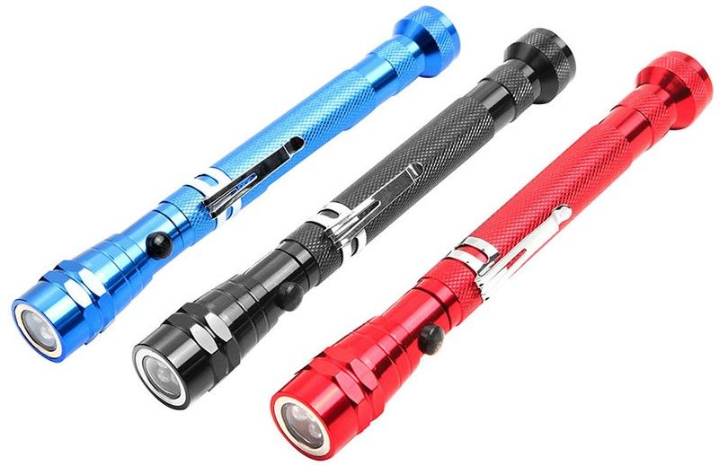Телескопічний магнітний збирач з підсвіткою призначений для зручного збору металевих предметів. Для ефективного виконання своїх функцій пристосування оснащено 2 магнітами на обох кінцях і 3 яскравими LED світлодіодами. Гнучка розсувна шийка має довжину 17.5 см в складеному стані і 57 см в повністю розкладеному. Міцний корпус виготовлений з алюмінію. Живлення пристрою забезпечують 4 батарейки Lr44. Модель представлена в трьох кольорах на вибір: чорному, синьому, червоному.