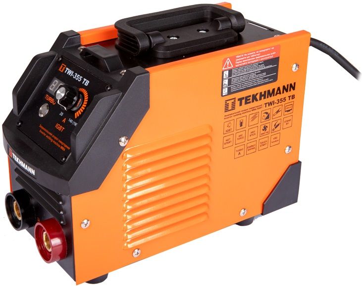 Інверторний зварювальний апарат Tekhmann TWI-355 TB розрахований на зварювання електродами діаметром 1,6–5,0 мм при струмі 20-140 А, або до 190 А у режимі TURBO. Пристрій має LCD-дисплей, енергозберігаючу систему, режим TURBO, захист від перевантаження, функції HOT START, ANTI-STICK, ARC FORCE, VRD, а також автоматичний режим очікування.
